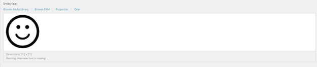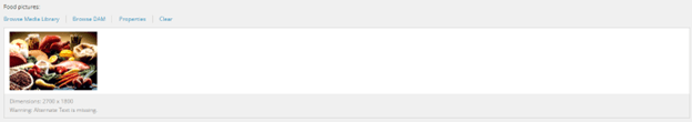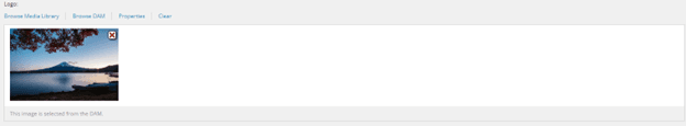 It allows one image from Bynder DAM to be selected. Web developer decides which derivative to use for rendering. This field type offers the following options: Browse Media Library, Browse DAM, Properties and Clear.